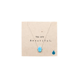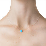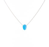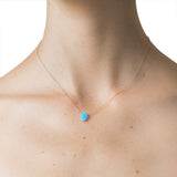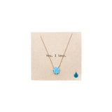 A Small Blue Opal Hamsa Necklace shines a sky blue in the light. On a sterling silver, gold, or rose gold filled 16-18inch adjustable chain. Hamsa measures 10mm.